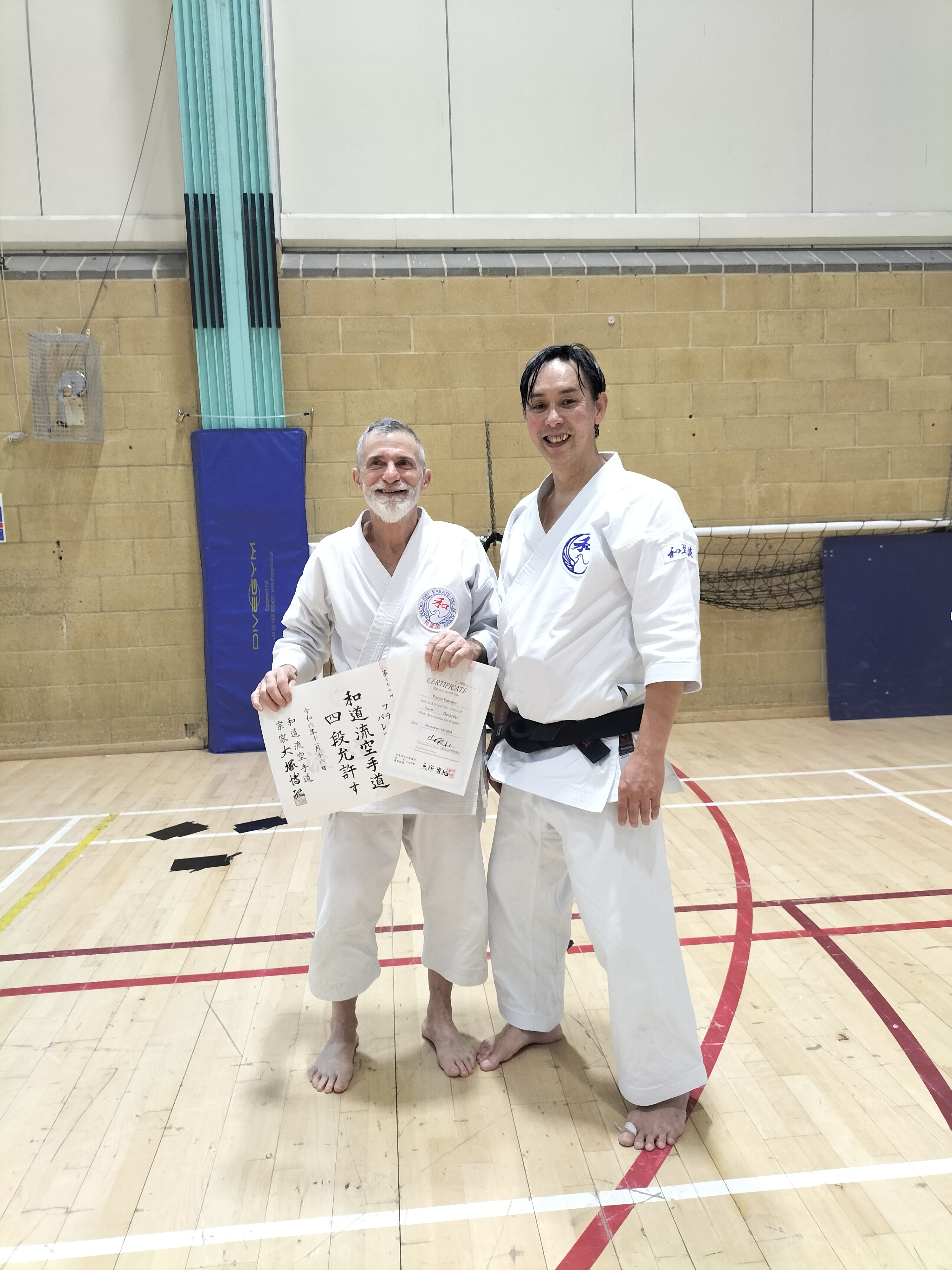 Già Maestro 6° Dan - Csen nel 2024 sostiene e supera gli esami da 4° Dan Wado Academy - Wado Renmei (nella foto con Hironori Otsuka III attuale Caposcuola Wado Ryu - Wado Renmei)